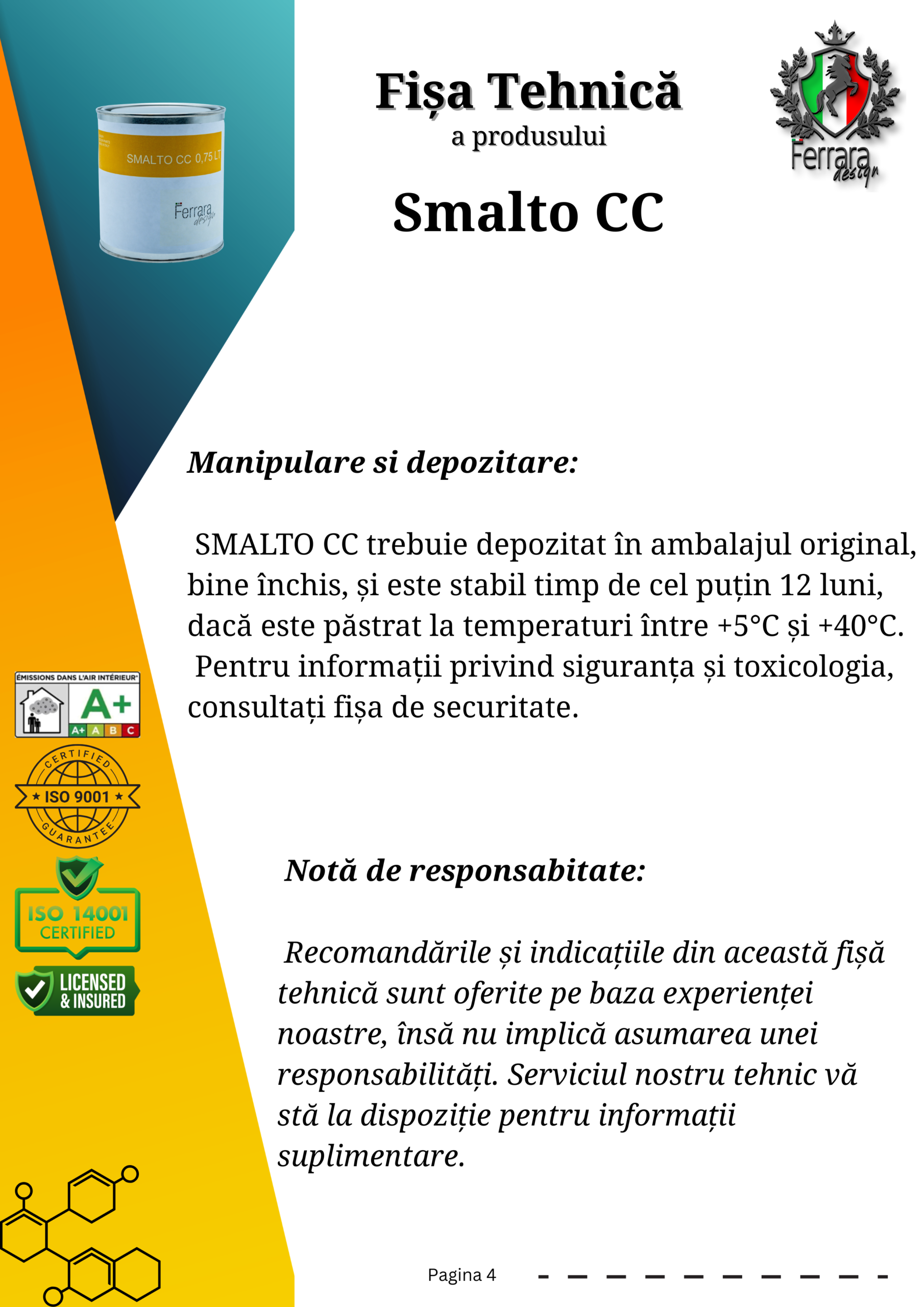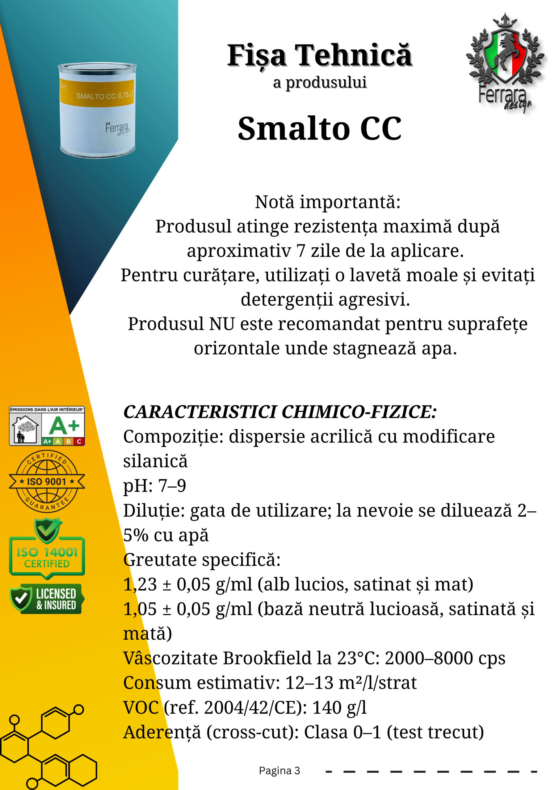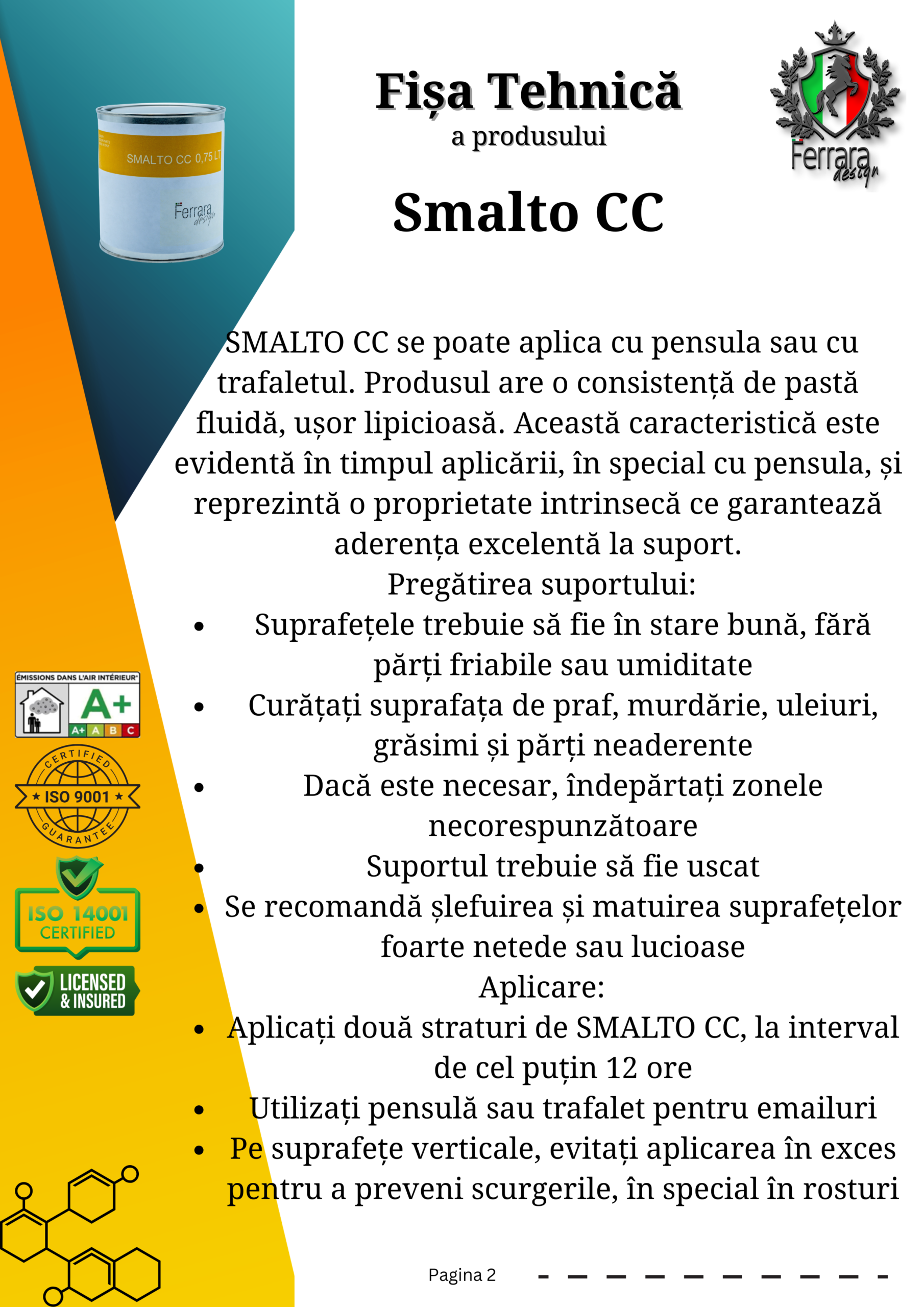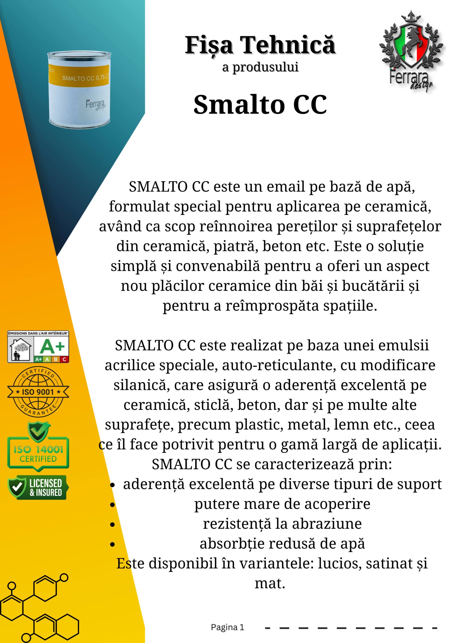 SMALTO CC este un email pe bază de apă, formulat special pentru aplicarea pe ceramică, având ca scop reînnoirea pereților și suprafețelor din ceramică, piatră, beton etc. Este o soluție simplă și convenabilă pentru a oferi un aspect nou plăcilor ceramice din băi și bucătării și pentru a reîmprospăta spațiile.