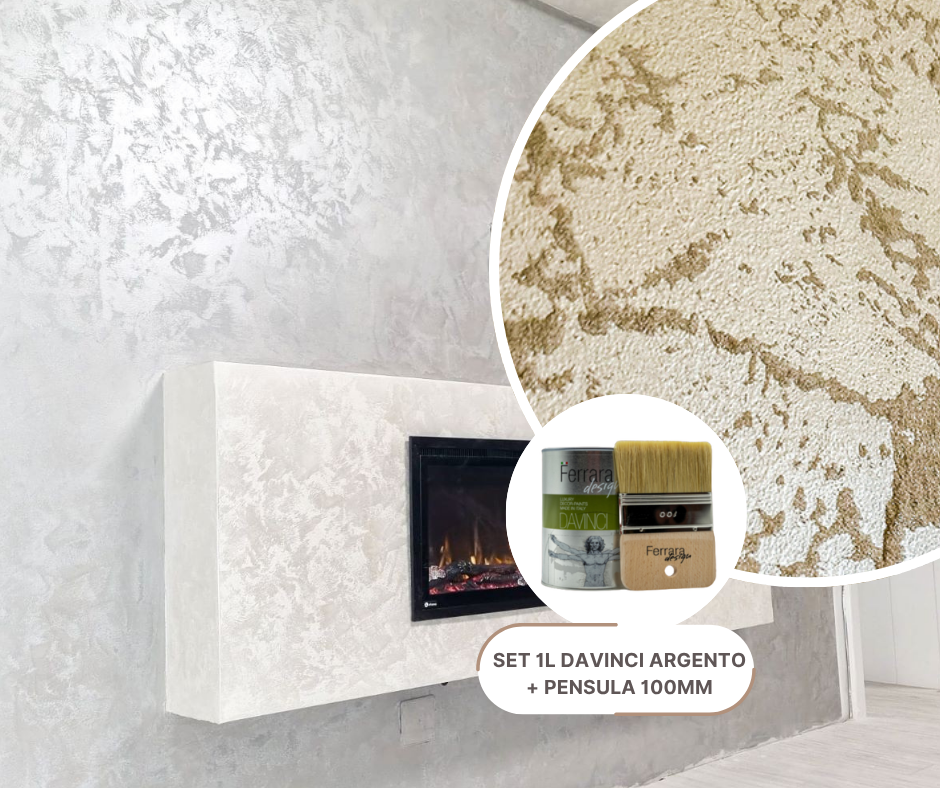 Set de 2 buc, vopsea decorativa Davinci argintiu 1l + 1 buc pensula Ferrara Design 100mm